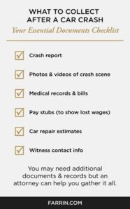 Collect all photos and videos you took at the scene, including damage to all vehicles, skid marks, road conditions, and any visible injuries. If you couldn’t take photos yourself, ask if a friend, family member, or witness did.