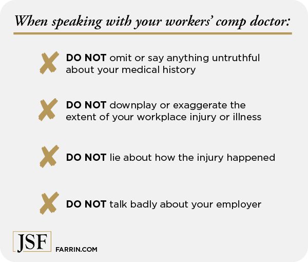 It’s important to be honest about your symptoms, pain level, and functional limitations. If your doctor does not have a realistic set of facts about your work-related injury or occupational illness, he or she could misdiagnose your condition and may not be able to give you proper medical care.